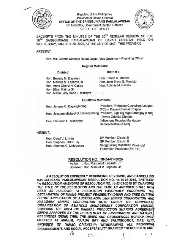 MATI, DAVAO ORIENTAL (February 7) — In a rare show of unity, the Sangguniang Panlalawigan of Davao Oriental has unanimously withdrawn its endorsement of mining projects linked to Austral-Asia Link Mining Corporation and Hallmark Mining Corporation, both operating under Asiaticus Management Corporation (AMCOR).